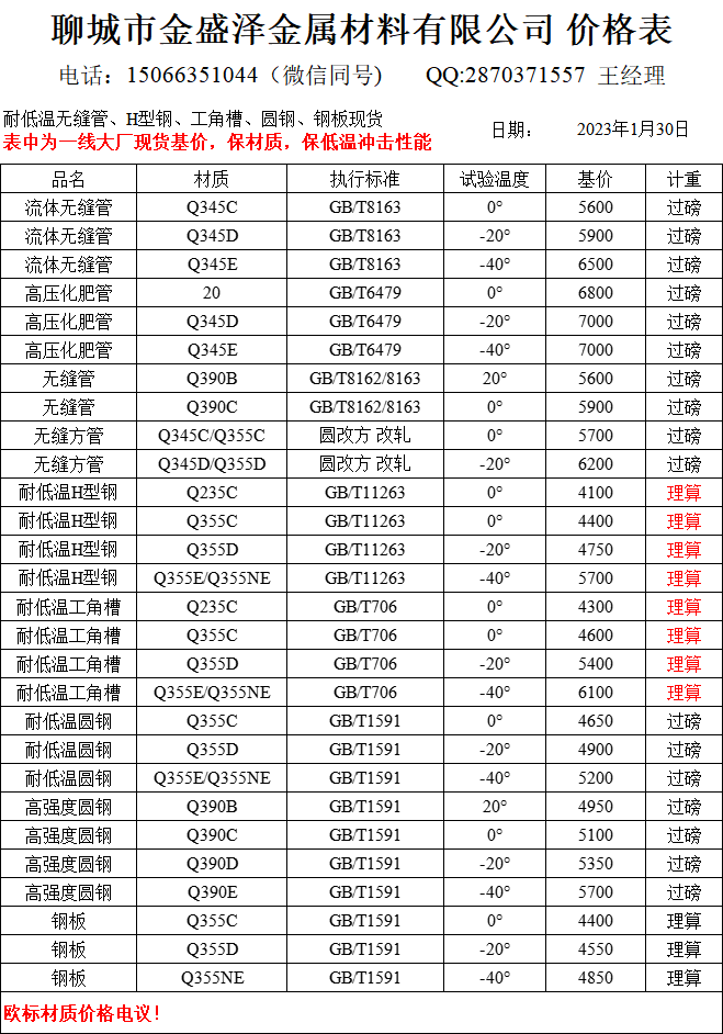 2023年1月30日 耐低溫鋼材價(jià)格基價(jià)表